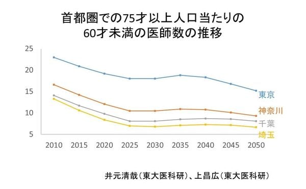 今後、状況は益々悪化する。図3は首都圏の75才人口1000人あたりの60歳以下の医師数の推移だ。情報工学を専門とする井元清哉教授(東大医科研)との共同研究である。
