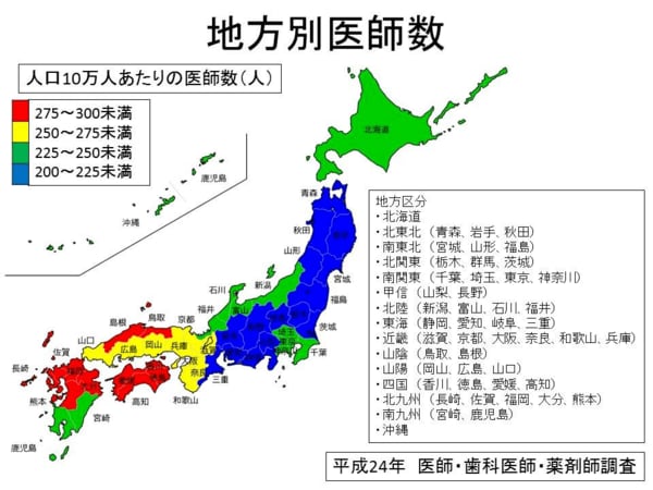 読者の多くは「東京には医者が多いので、埼玉県、千葉県、神奈川県で多少不足しても問題ない」とお考えかもしれないが、この考えは間違っている。首都圏では医師の絶対数が足りないからだ。人口10万人あたりの医師数は230人にすぎない。四国は278人、九州北部は287人だ。実に2割以上の差がある。