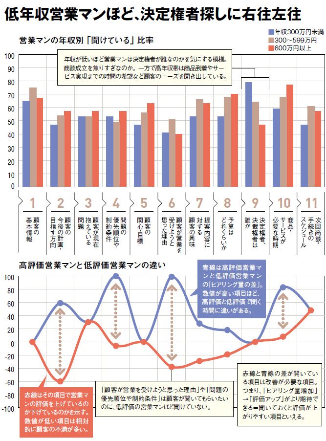 まず、グラフは、営業マンが商談時に聞き出す話題を年収別に示したものである。たとえば、10で示した「商品・サービスが必要な時期」については年収600万円以上の営業マンは年収300万円未満の営業マンに比べて意識して聞き出していることがわかる。